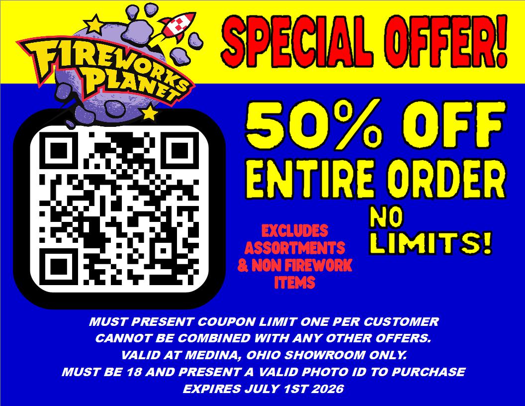 Take advantage of this exclusive, Grand Re-Opening offer! Sign up for even deeper discounts right in your inbox, and remember, we always accept all other competitor's fireworks coupons. (coupon must be from a store in Ohio)