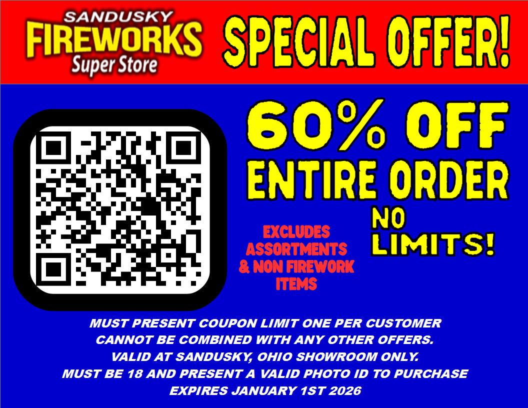 Take advantage of this exclusive, New Years Eve offer! Sign up for even deeper discounts right in your inbox, and remember, we always accept all other competitor's fireworks coupons. (coupon must be from a store in Ohio)